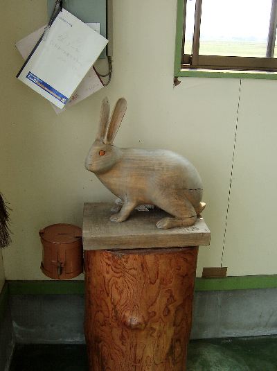| 小さな待合室に置いてあるこの駅のマスコット?。チラッと見えるノートは、観光客の寄せ書き帳です。 |