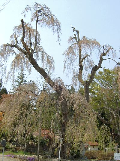 | 「白兎のしだれ桜」。ピークを過ぎて落花盛んの状態なので、緑の中にピンクがちらほらで、桜の感じはわずか。樹齢800年ほどだそうです。久保桜と並んで、置賜の桜回廊のコースに含まれています。 |