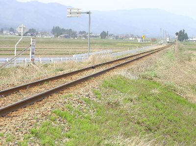 別に踏み切りを歩かなくても、用水路沿いを歩いていくとすぐ近くまで行けました。線路の反対側からパシャリ。今はもう取り外されているようです。探して線路を歩かないでください。 |