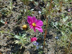 | 落柿舎の南辺りには、コスモスが咲いています。紅葉も飽きたので、デジカメで上手く背景がボケるか試してみました。 | 同じくバラ。オートの撮影ですが、上手く中央にピントがあってくれました。 | |
