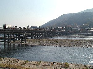 | 船下りの情景。水は結構澄んでいました。 | 昼食を終えて、渡月橋に出ました。逆光なのでこれが限界。 | |