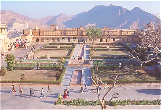 | 城塞とは言ってもマハラジャの居城。いろいろ装飾が施されていて豪華です。広いので内部の移動も馬車を使ったとか。でも、外敵を考慮して道は狭めてあったそうです。 |